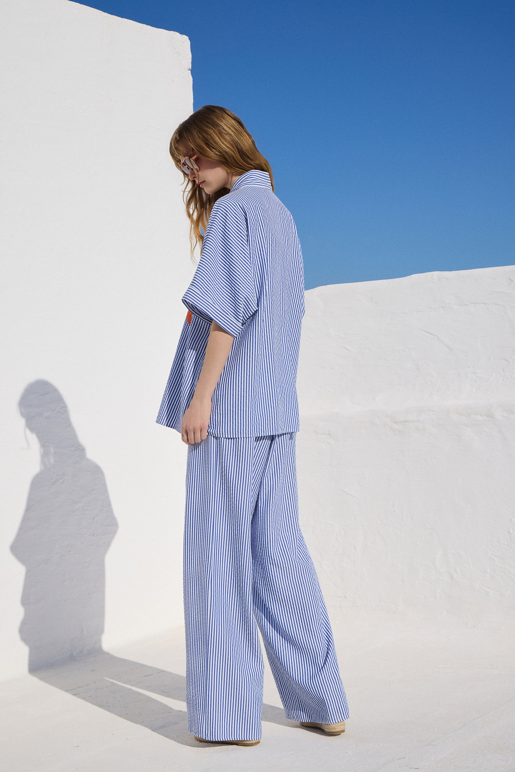 Αέρινο και σύγχρονο, αυτό το φαρδύ παντελόνι από βαμβακερό ύφασμα συνδυάζει άνεση και στιλ. Οι κάθετες ρίγες χαρίζουν κομψότητα, ενώ το λάστιχο στη μέση προσφέρει τέλεια εφαρμογή. Το διακριτικό κέντημα στην τσέπη προσθέτει ένα μοναδικό fashion detail που αναβαθμίζει το look.