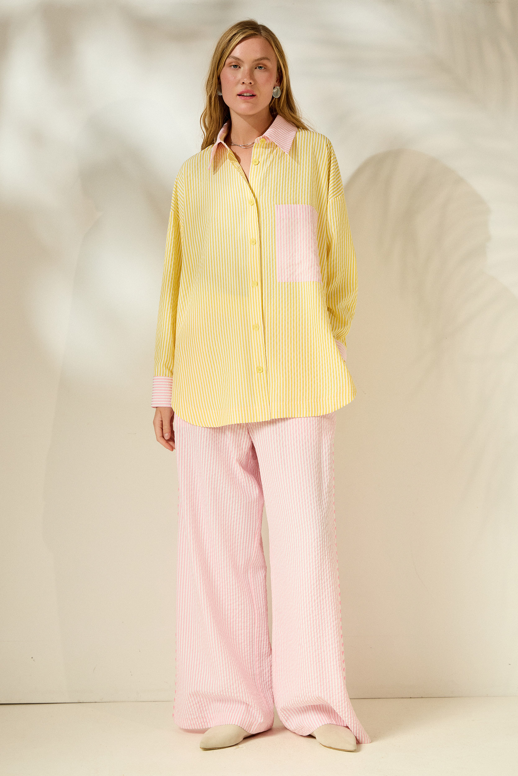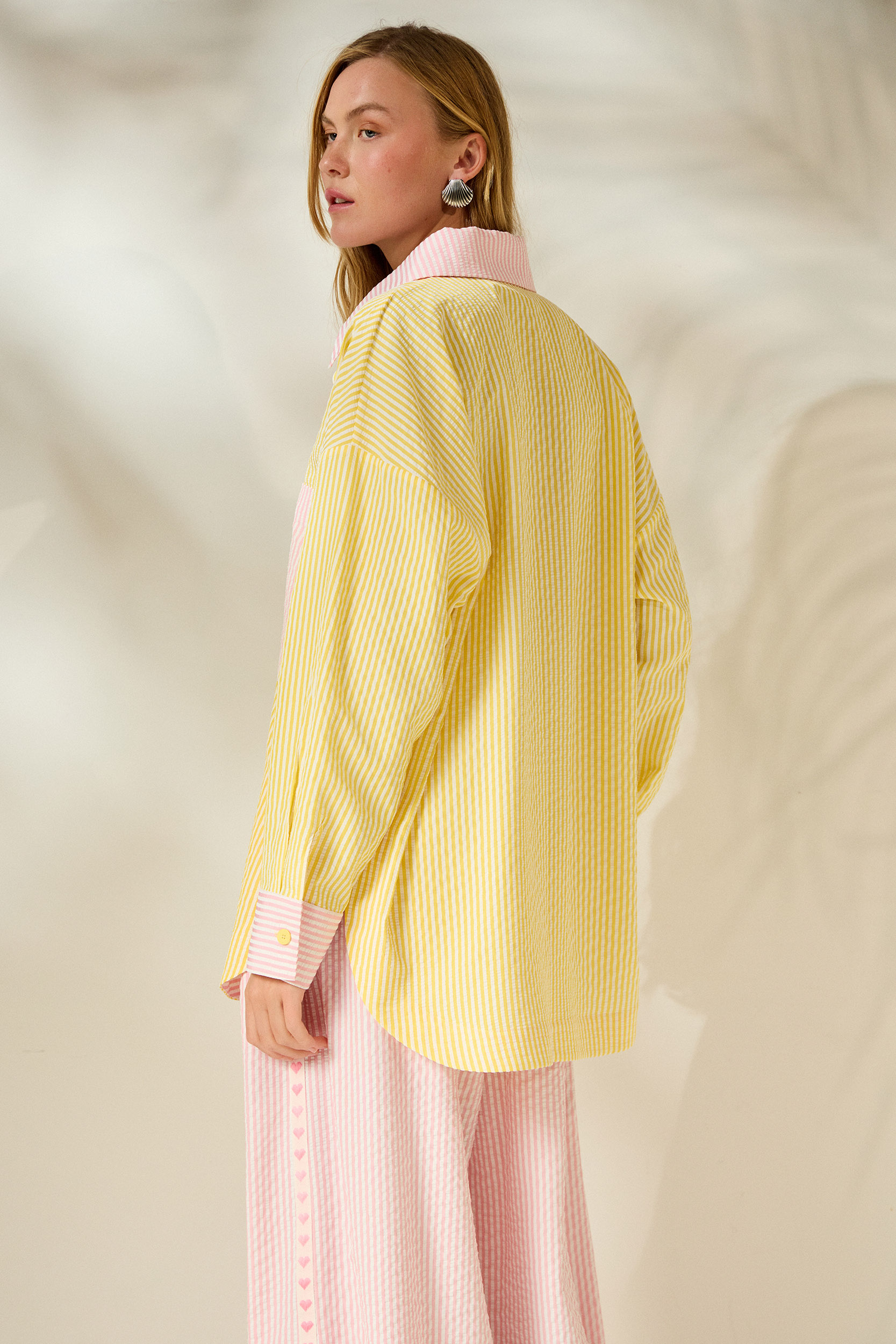 Statement oversized shirt with a playful striped pattern and color contrasts that stand out. The relaxed, wide line offers comfort and modern aesthetics, while the special details create a unique fashion effect. Perfect for standout, effortless looks.