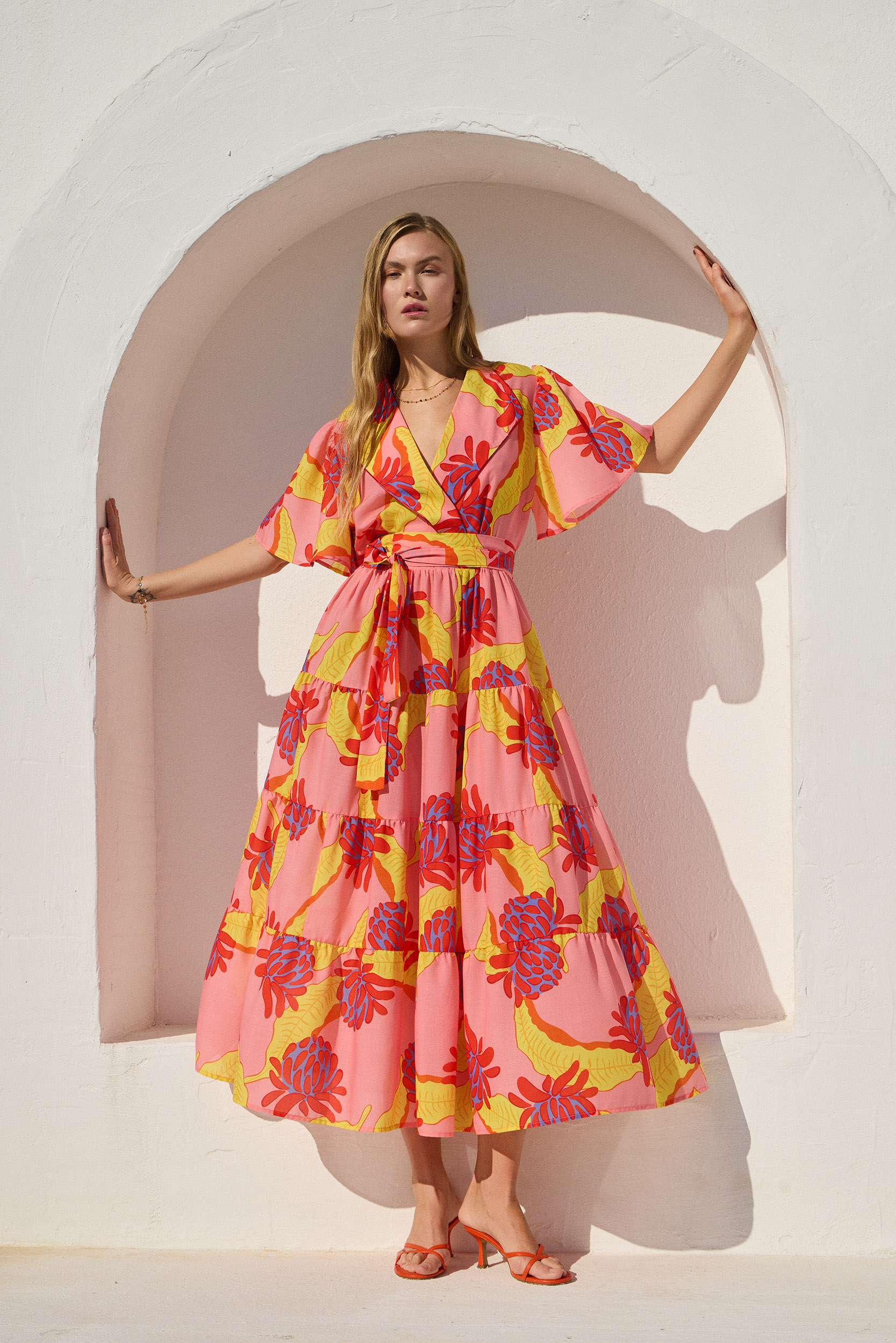 The dress you’ll wear non-stop this summer! With a bold colorful print and a crossover line that flatters the figure, it’s the perfect choice for effortless looks all day long. Airy and eye-catching, this midi dress stands out with its vibrant colorful print and feminine line.